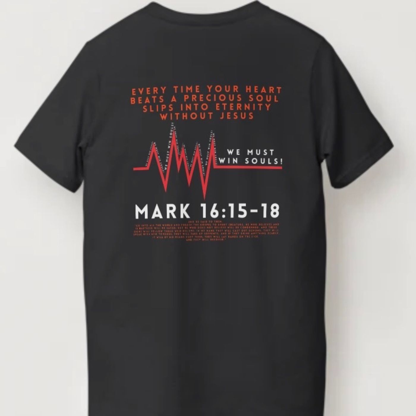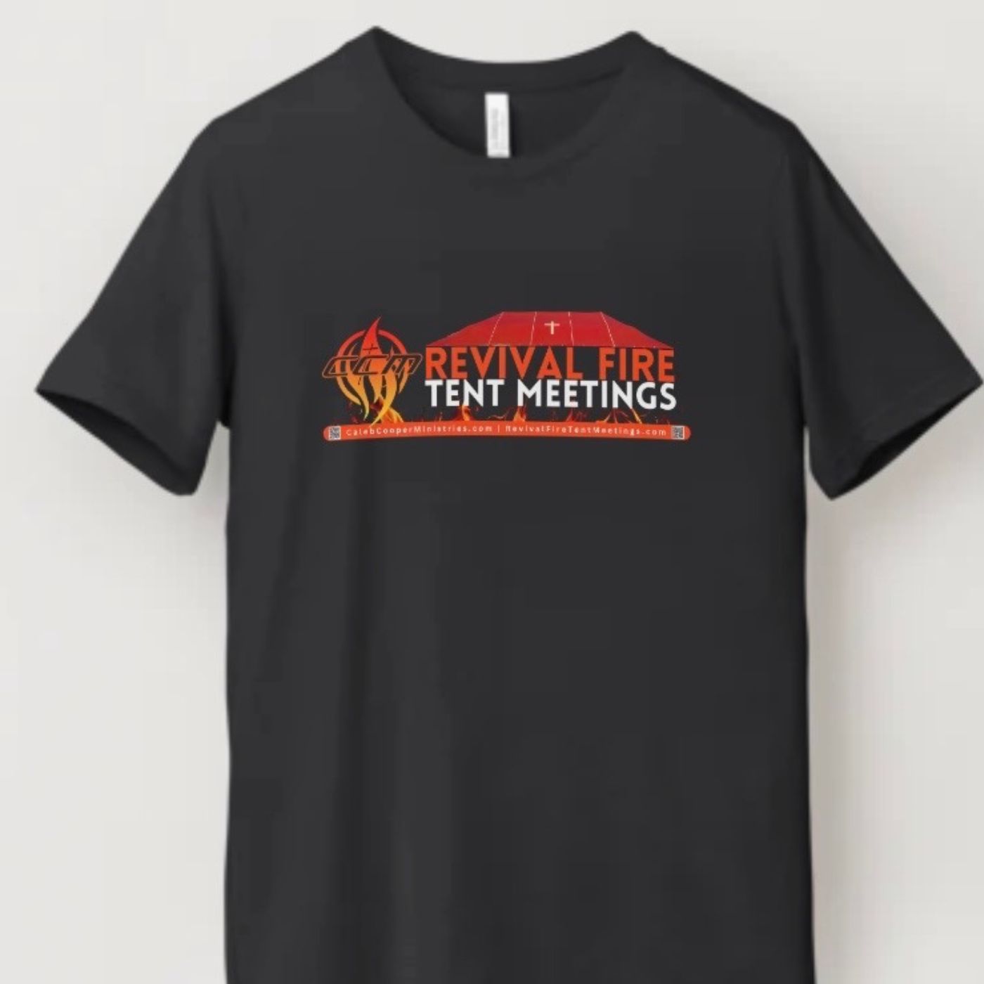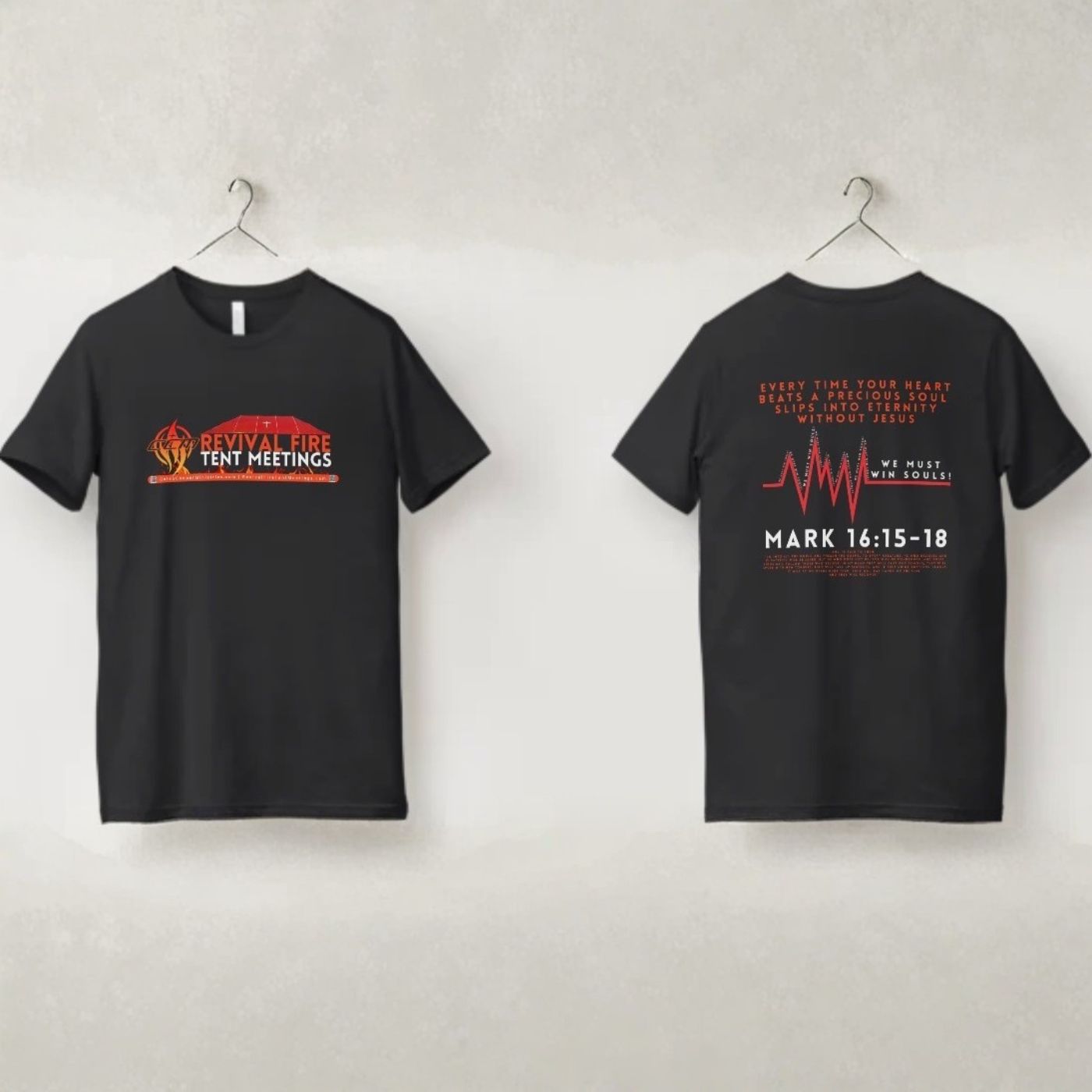 A bold faith-based tee featuring Revival Fire Tent Meetings branding and a powerful Mark 16:15–18 message. Designed to spark conversation and carry the mission wherever you go.